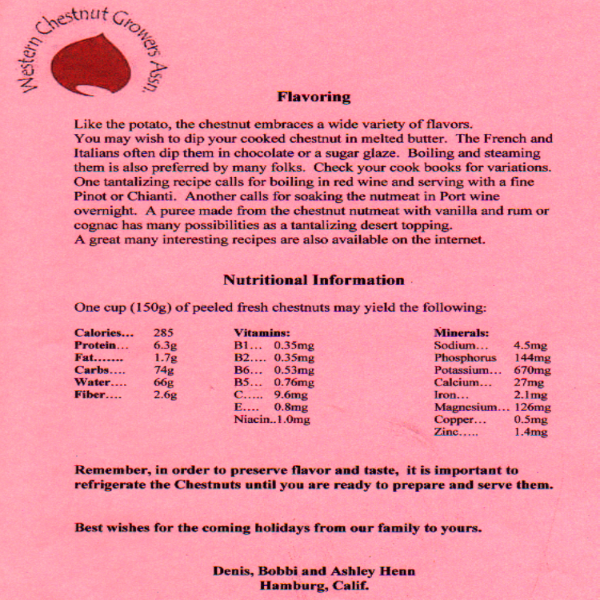 The chestnuts retail for appx. $5 - $7/pound. Thus far we have