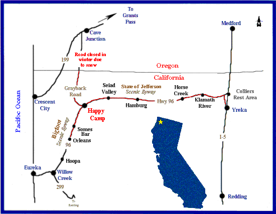 | The property we call Rocky Bar Ranch is located 40 miles west of Interstate 5 on the California State Scenic Highway 96. The average elevation above sea level is appx 1500 feet. The property consists of two separate adjacent parcels. One parcel of appx 20 mostly flat acres is situated between the State Hwy 96 and the Klamath River. The southern property boundary is appx the State Hwy. The northern property boundary of this parcel extends to the far northern side of the river. The Klamath River is renown as a salmon and steelhead fishery.